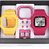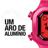 Kit com 2 pulseiras de silicone, 1 aro de alumínio, 1 fivela de alumínio e 4 “poussoir” (anel colorido do botão) de alumínio.